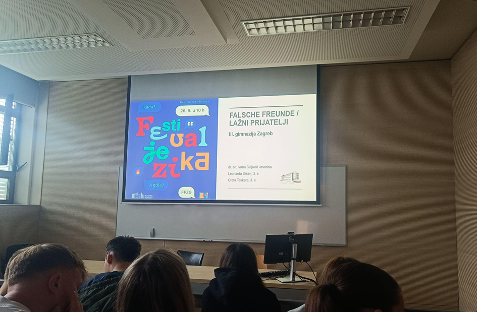 Poslije predavanja o grčkoj mitologiji, dočekalo nas je predavanje „Falsche Freunde“ („Lažni prijatelji“), koje je vodila dr. sc. Ivana Cvijković Javorina. Naslov vam možda neće odmah ukazati na temu, osim ako ne znate da se radi o leksemima lažnih prijatelja u njemačkom, engleskom i drugim jezicima. Primjerice, saft na hrvatskom jeziku znači umak, a na njemačkom Saft znači sok. Pomoću takvih primjera možemo lakše i brže naučiti ne samo njemački, nego i bilo koji drugi jezik. Predavačica je također otkrila da nam i razlike i sličnosti među jezicima mogu pomoći u učenju. Nakon predavanja odigrali smo Kahoot! kviz koji je bio pun takvih primjera.