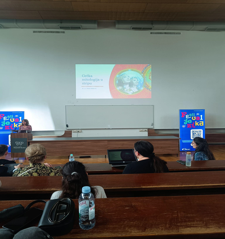 Nakon toga, uputili smo se na predavanje koje je većinu učenika najviše zanimalo: „Grčka mitologija u stripu“. Predavanje je vodila dr. sc. Petra Matović. Iako je glavna tema bila grčka mitologija u stripu, predavanje je započelo predstavljanjem grčke mitologije u različitim umjetnostima: arhitekturi, književnosti, kiparstvu, drami, glazbi, filmu, plesu, pa i u stripu. Predavačica je također pojasnila kako je grčka mitologija izgradila današnje društvo te i danas ima utjecaja na arhitekturu, kiparstvo i književnost.