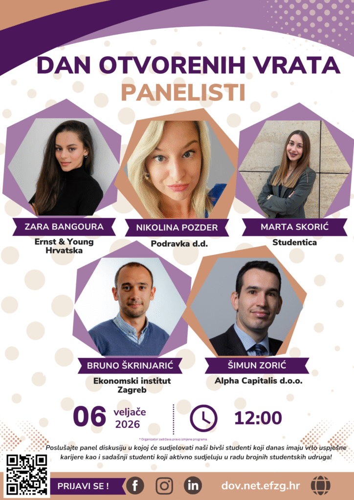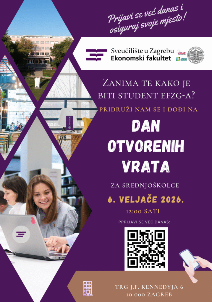 Na Ekonomskom fakultetu Sveučilišta u Zagrebu će se u petak, 6. veljače 2026. godine održati Dan otvorenih vrata Ekonomskog fakulteta Zagreb, namijenjen učenicima završnih razreda srednjih škola.