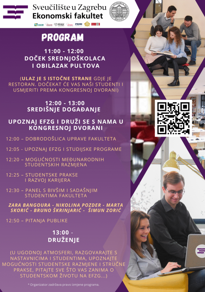Cilj događaja je predstaviti svim zainteresiranim srednjoškolcima kako je biti student Ekonomskog fakulteta Sveučilišta u Zagrebu te im odgovoriti na sva pitanja koja ih zanimaju vezano uz studiranje. I učenici naše škole imat će priliku prisustvovati ovom događaju i pobliže upoznati Ekonomski fakultet.
