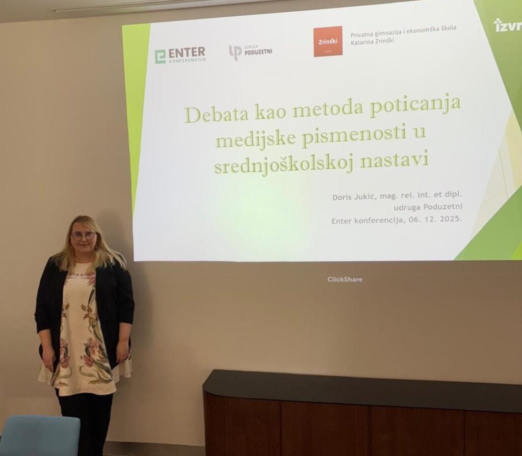Na konferenciji je izlagala i predsjednica udruge Poduzetni, Doris Jukić, čije je izlaganje bilo posvećeno razvoju medijske pismenosti kroz debatne aktivnosti koje se provode u našoj školi u sklopu predmeta Medijska pismenost i poslovna komunikacija. Izlaganje je otvorilo važnu temu koja se danas smatra temeljnim preduvjetom odgovornog i informiranog građanstva jer kada se učenici svakodnevno susreću s velikim brojem informacija, često proturječnih ili manipulativnih, medijska pismenost postaje ključna za njihovu sposobnost snalaženja u javnom prostoru. Nastavnica Jukić naglasila je da je debata jedan od najučinkovitijih pedagoških pristupa za razvoj kritičkog mišljenja, evaluacije izvora i argumentiranja stavova. Kroz pripremu za debatu učenici uče analizirati medijske sadržaje, razlikovati relevantne podatke od neprovjerenih tvrdnji, prepoznavati tehnike manipulacije te osvještavati načine na koje se informacije oblikuju u javnom diskursu. Učenici razvijaju i niz dodatnih vještina poput javnog nastupa, aktivnog slušanja i suradničkog rada, a nastavnica Jukić predstavila je i praktične primjere iz vlastite prakse koji jasno pokazuju kako debatiranje pomaže učenicima ne samo u prepoznavanju dezinformacija i razlikovanju činjenica od mišljenja, nego i u izgradnji samopouzdanja i komunikacijske sigurnosti, nužnih za uspješno i odgovorno sudjelovanje u digitalnom i društvenom okruženju.